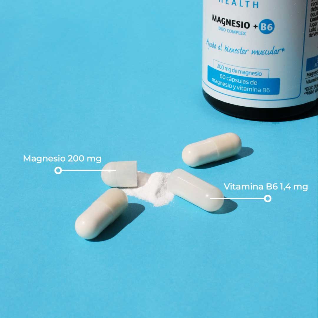 Ingredientes: Sales magnésicas de ácido cítrico, bisglicinato de magnesio, cápsula vegetal: agente de recubrimiento (hidroxipropilmetilcelulosa), colorante (carbonato de calcio), agente de carga (celulosa microcristalina), antiaglomerante (sales magnésicas de ácidos grasos), clorhidrato de piridoxina (vitamina B6).
